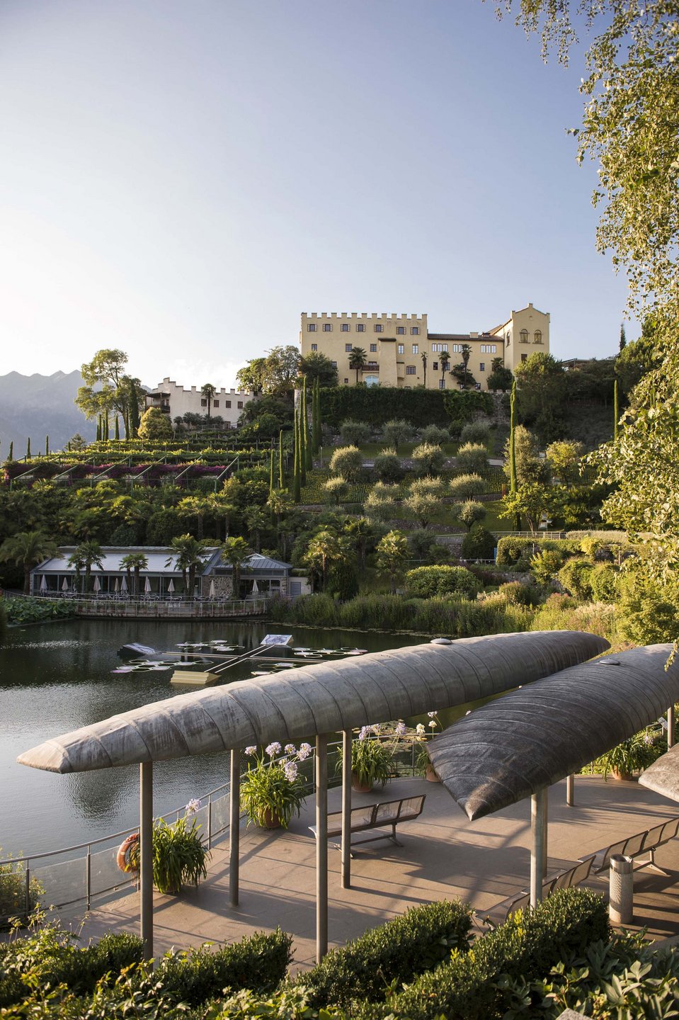 Ebenso eindrucksvoll sind die Ausblicke auf das umliegende Panorama. Die Gärten liegen in Hanglage und öffnen sich wie ein natürliches Amphitheater über dem Etschtal. Zwei Plattformen geben den Blick frei auf die Gartenwelten, die Stadt Meran und die umliegende Berglandschaft. Besonders faszinierend wirkt der sogenannte Matteo Thun’sche Gucker: eine spektakuläre Aussichtsplattform mit Blick auf die Burgen und Schlösser des Tals und die Gipfel der Texelgruppe im Norden.