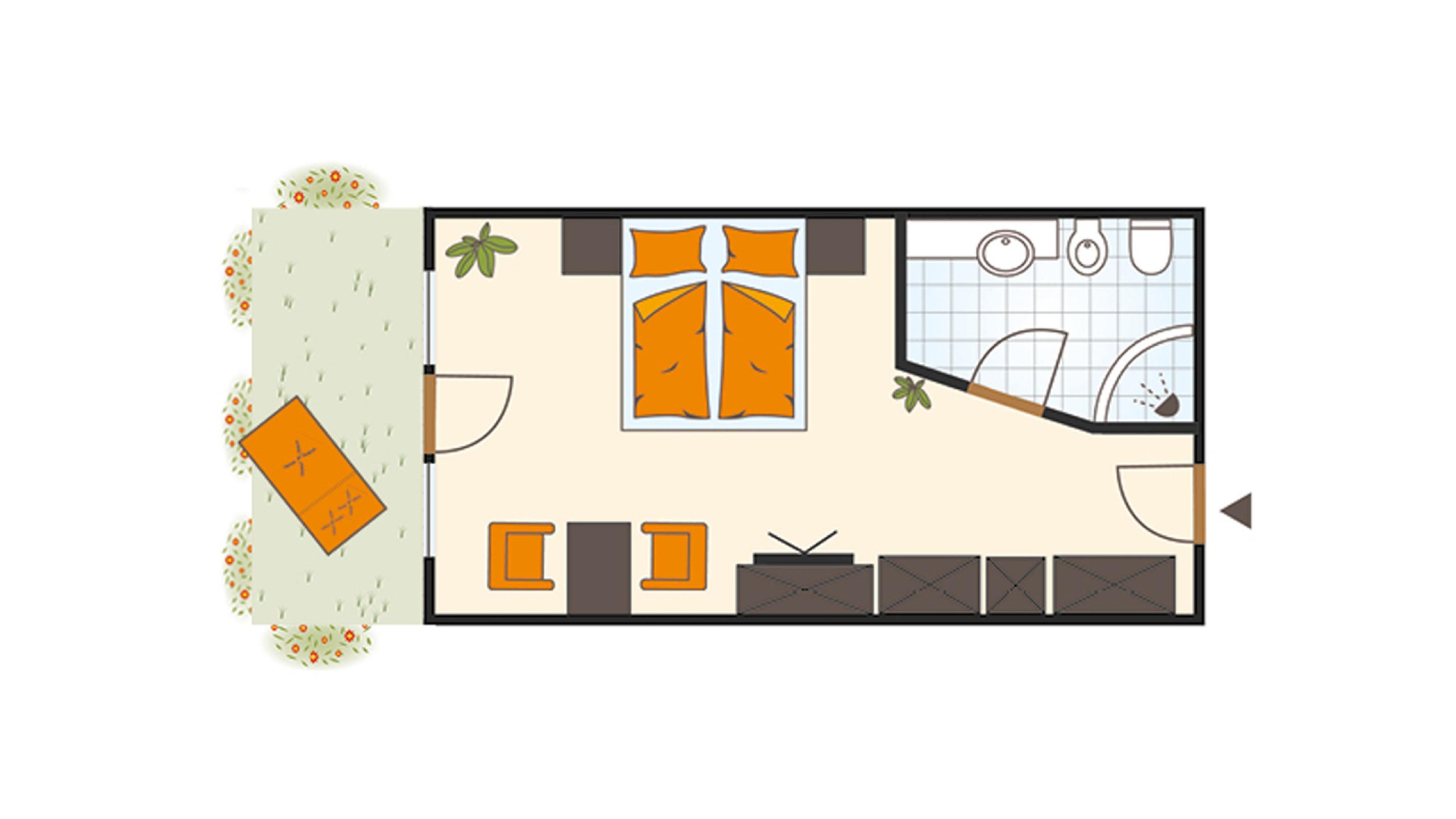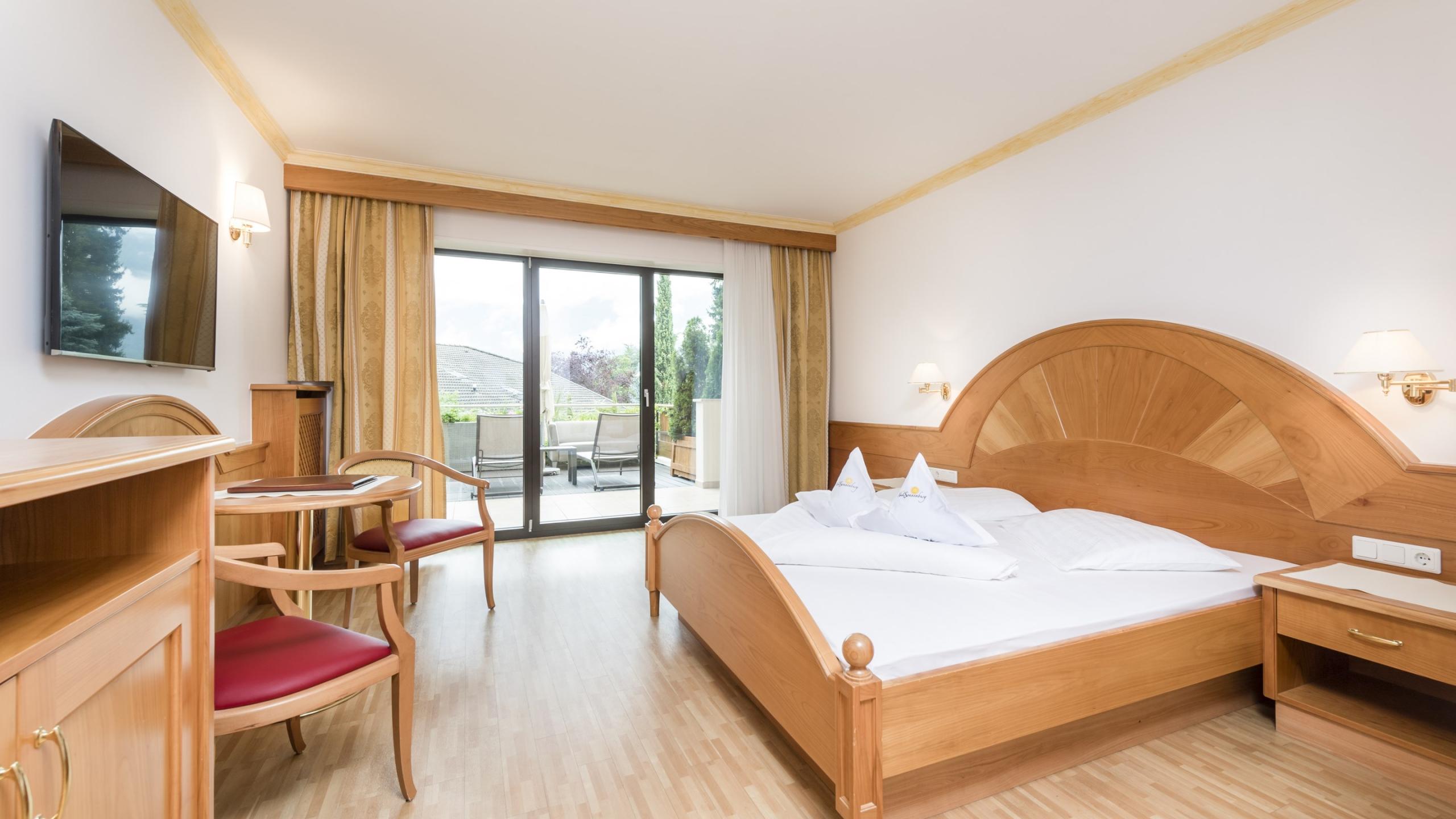 Doppelzimmer im Erdgeschoss mit privater Terrasse, Sonnenliege und -schirm, Sitzgelegenheit, SAT-TV, Radio, Safe, Telefon, WLAN, Minibar, Klimaanlage, Badezimmer mit Dusche, Bidet, WC, Haartrockner und Kosmetikspiegel, Wellnesstasche mit Bademantel, Sauna- und Badetüchern sowie Badepantoffeln.
